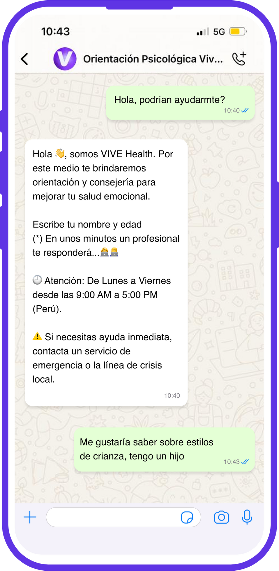 Accede a terapia psicológica de calidad y asequible en América Latina con Vive Health. Conecta con terapeutas de confianza y reserva citas fácilmente desde cualquier lugar. Disfruta de precios accesibles, tratamientos basados en evidencia, y una experiencia personalizada.